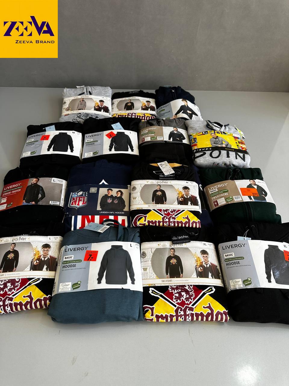 مجموعهای از هودیهای مردانه در بستههای کیلویی شامل مدلهای اسپرت و روزمره با کیفیت اورجینال اروپایی، مناسب فروشگاهها و مغازهداران.